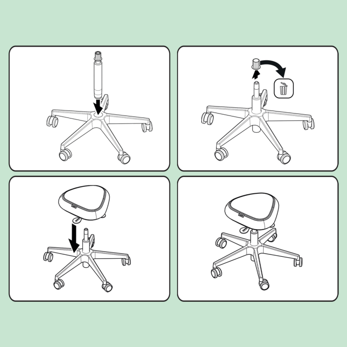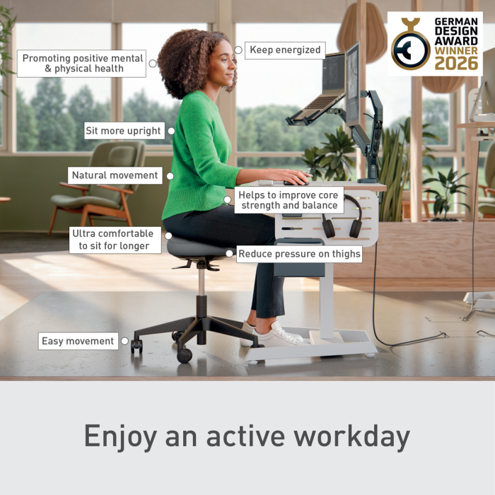 Trojuholníkový tvar sedadla, podobný sedlovým stoličkám, rovnomerne rozkladá hmotnosť na panvové kosti. Mäkké penové čalúnenie znižuje tlak na stehná a nohy celkovo.