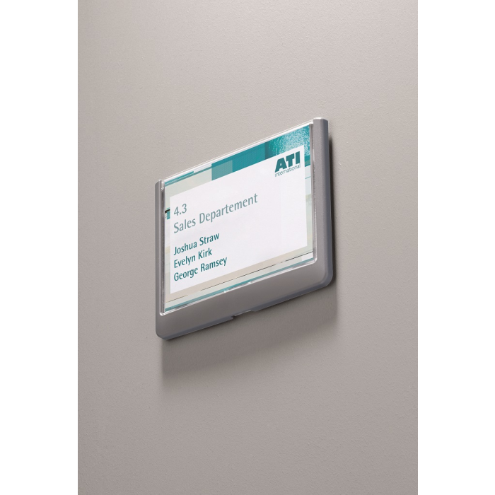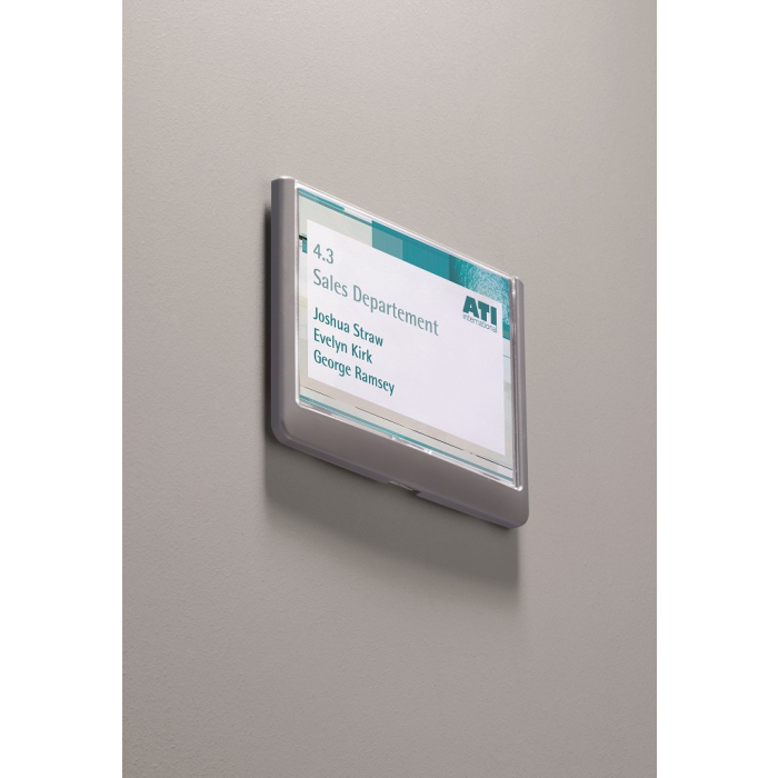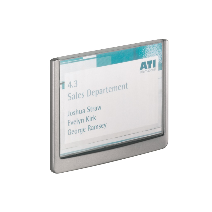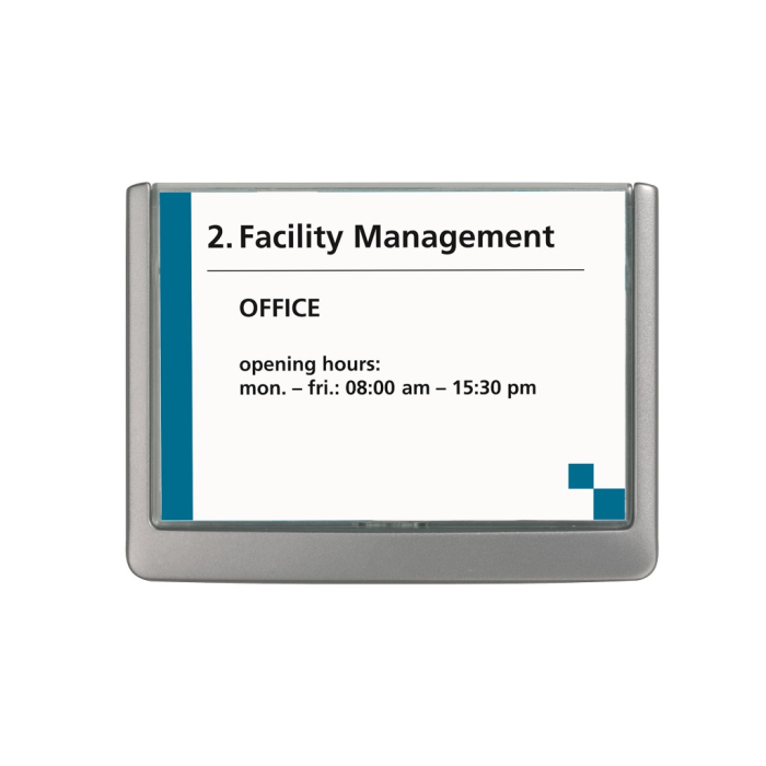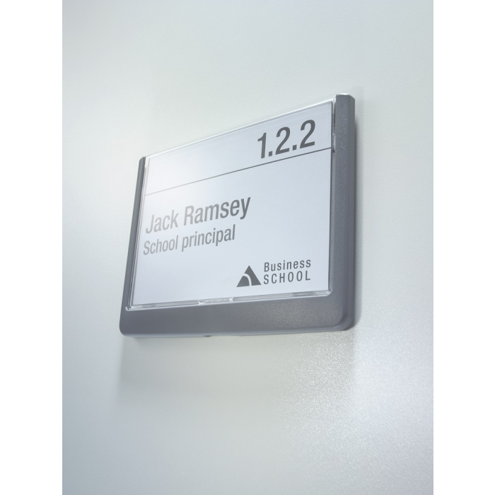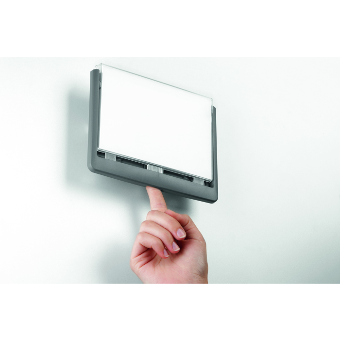Moderná informačná tabuľka na dvere s lemom v atraktívnej grafitovej farbe. Predný panel sa otvára na jedno zatlačenie, a tým sa jednoducho sprístupnia vložené popisné papiere, ktoré sa môžu vymieňať podľa potrieb. Tabuľka je ideálna do kancelárií, úradov, škôl, univerzít a hotelov. Súčasťou balenia je montážna sada s názorným návodom. Namiesto pevného montovania môže byť tabuľka k povrchu aj prilepená.
