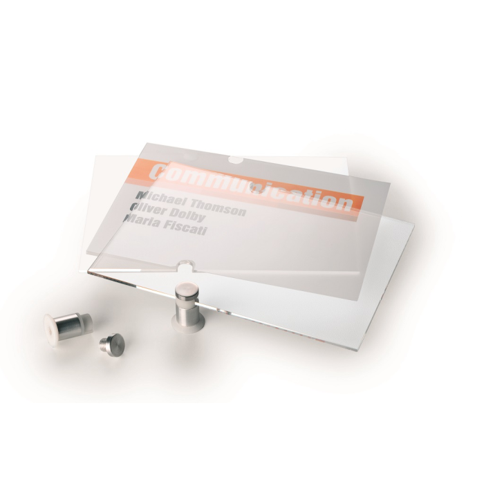 Tabuľka na dvere z novej rady v elegantnom, atraktívnom, a zároveň jednoduchom dizajne. Dodávaná s 2 polopriehľadnými vnútornými listami, vhodnými na farebnú alebo čiernu potlač. Listy sa vložia medzi akrylové panely tabuľky a tabuľka sa prichytí k stene alebo dverám 2 veľkými hliníkovými skrutkami. Ľahká montáž, názorný návod je priložený.