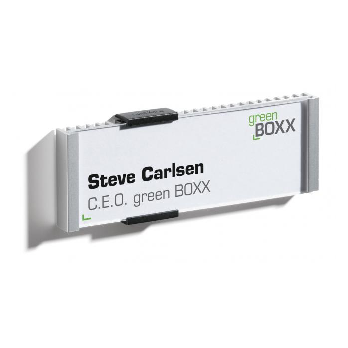 Informačná tabuľka na dvere. Štylizovaná tabuľka vo vrúbkovanej úprave, spodná časť z vysoko kvalitného hliníka, fixujúce spojky v čiernej farbe. K podkladu môže byť zadnou časťou priskrutkovaná alebo nalepená. Text je chránený neoslňujúcim akrylátovým krytom, ktorý pridržiavajú dve fixujúce spojky. Súčasťou balenia je montážna sada s názorným návodom a čistým listom papiera vo veľkosti tabuľky.