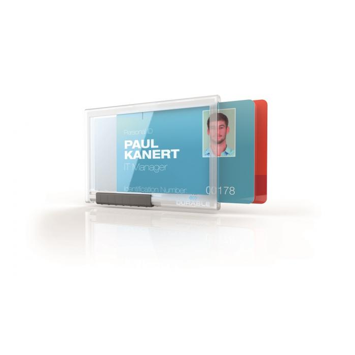Puzdro z priehľadného plastu vysokej kvality pre 2 karty. Je možné použiť na výšku aj na šírku. Farba priehľadná. S posuvníkom pre šetrné vybratie karty. Upevňovací držiak odolný proti rozbitiu napr. pre klip, textilný pásik alebo jojo s puzdrom na preukaz. Vnútorné rozmery: 54×87 mm (vך)