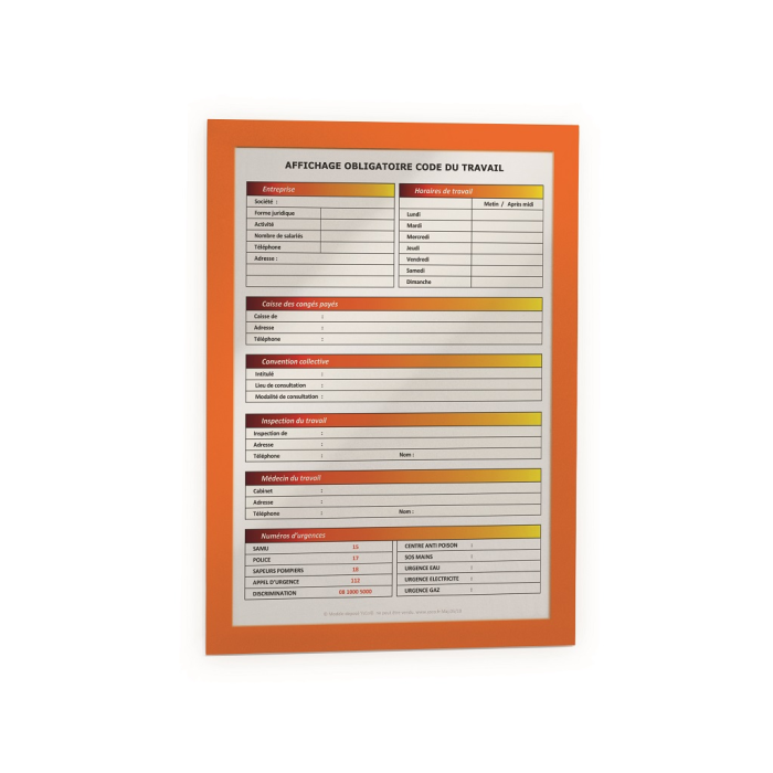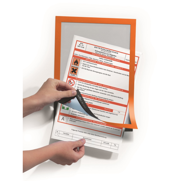 Samolepiaci informačný panel s prednou magnetickou časťou. Ideálny na vystavovanie plagátov, kľúčových informácií, špeciálnych oznamov alebo dôležitých čísel. Informácie sa ľahko vymieňajú a sú čitateľné z oboch strán, ak sa panel umiestni napr. na okno alebo priehľadné dvere. Vhodný na hladké a pevné povrchy. V prípade potreby je ľahko premiestniteľný bez potreby vŕtania. Formát A4, rámik oranžový.